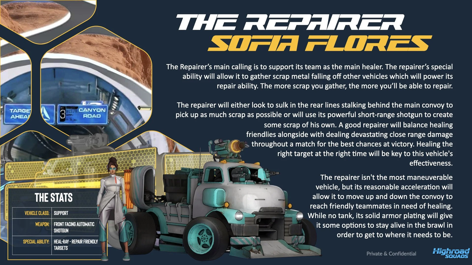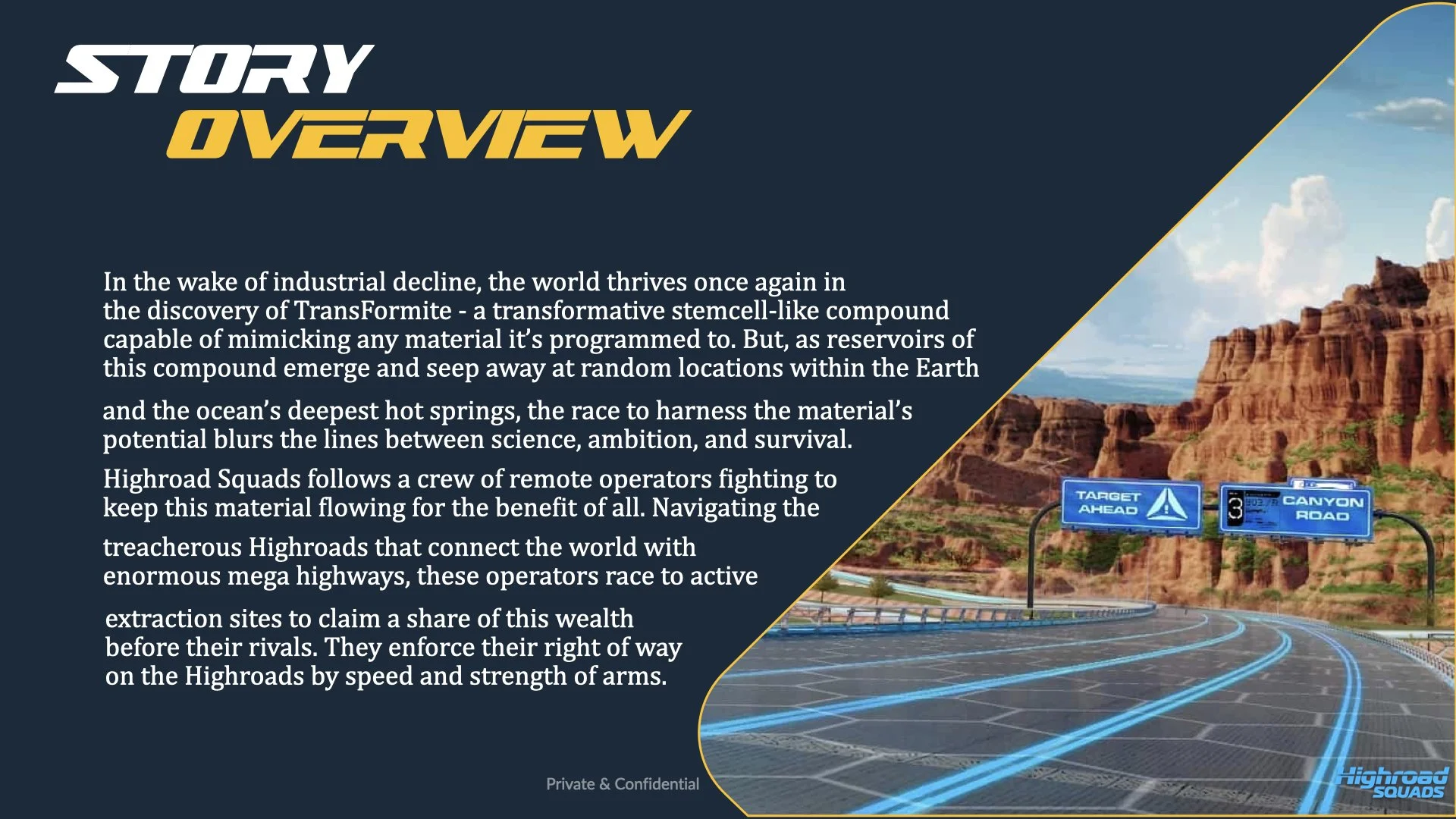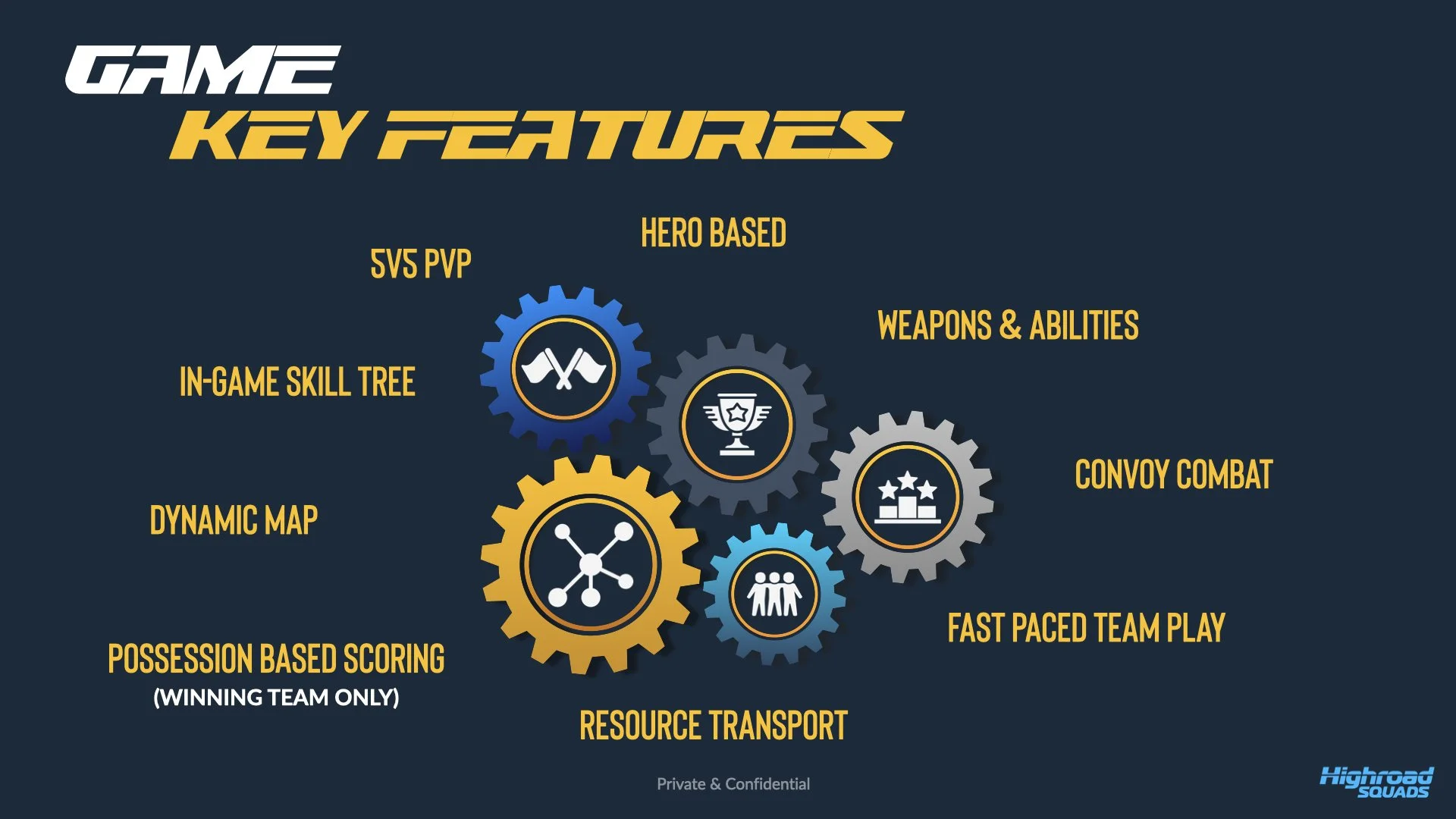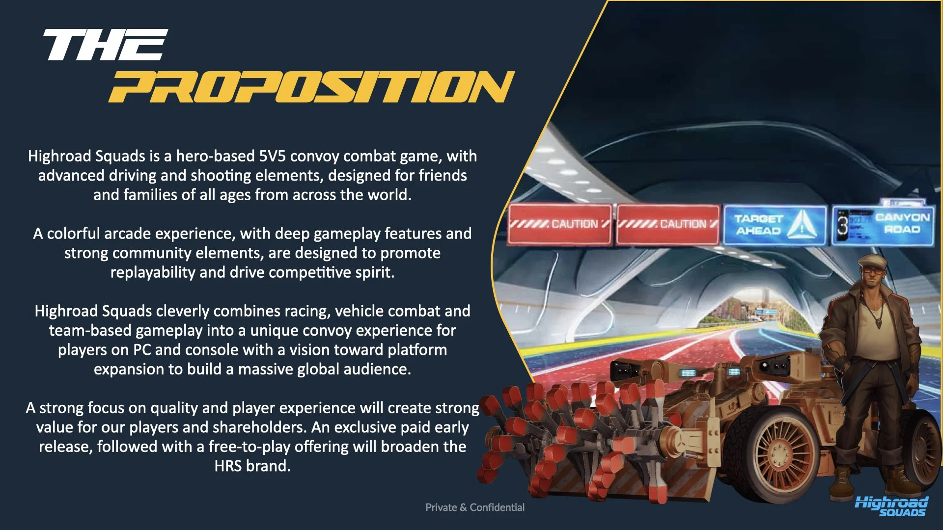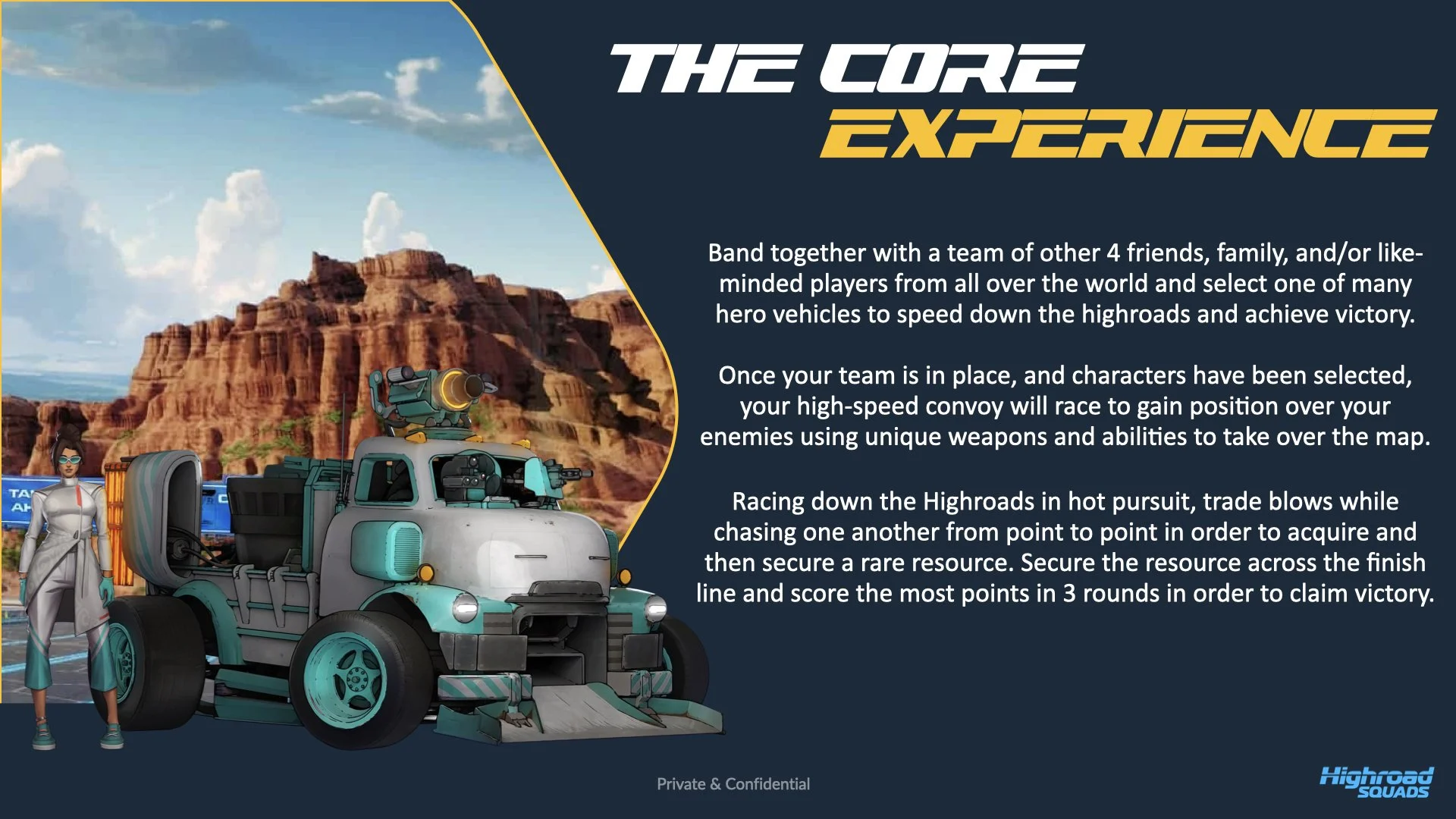 Highroad Squads was a new video game IP seeking investment. A group of seasoned developers set out to make an innovative, hero-based, 5V5 convoy combat game, with advanced driving and shooting elements, designed for friends and families of all ages from across the world. The colorful arcade experience, with deep gameplay features and strong community elements, are designed to promote replayability and drive competitive spirit.
