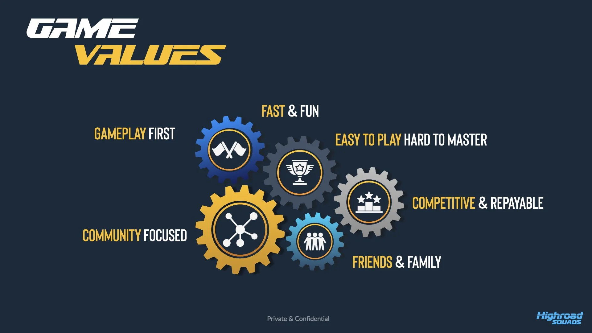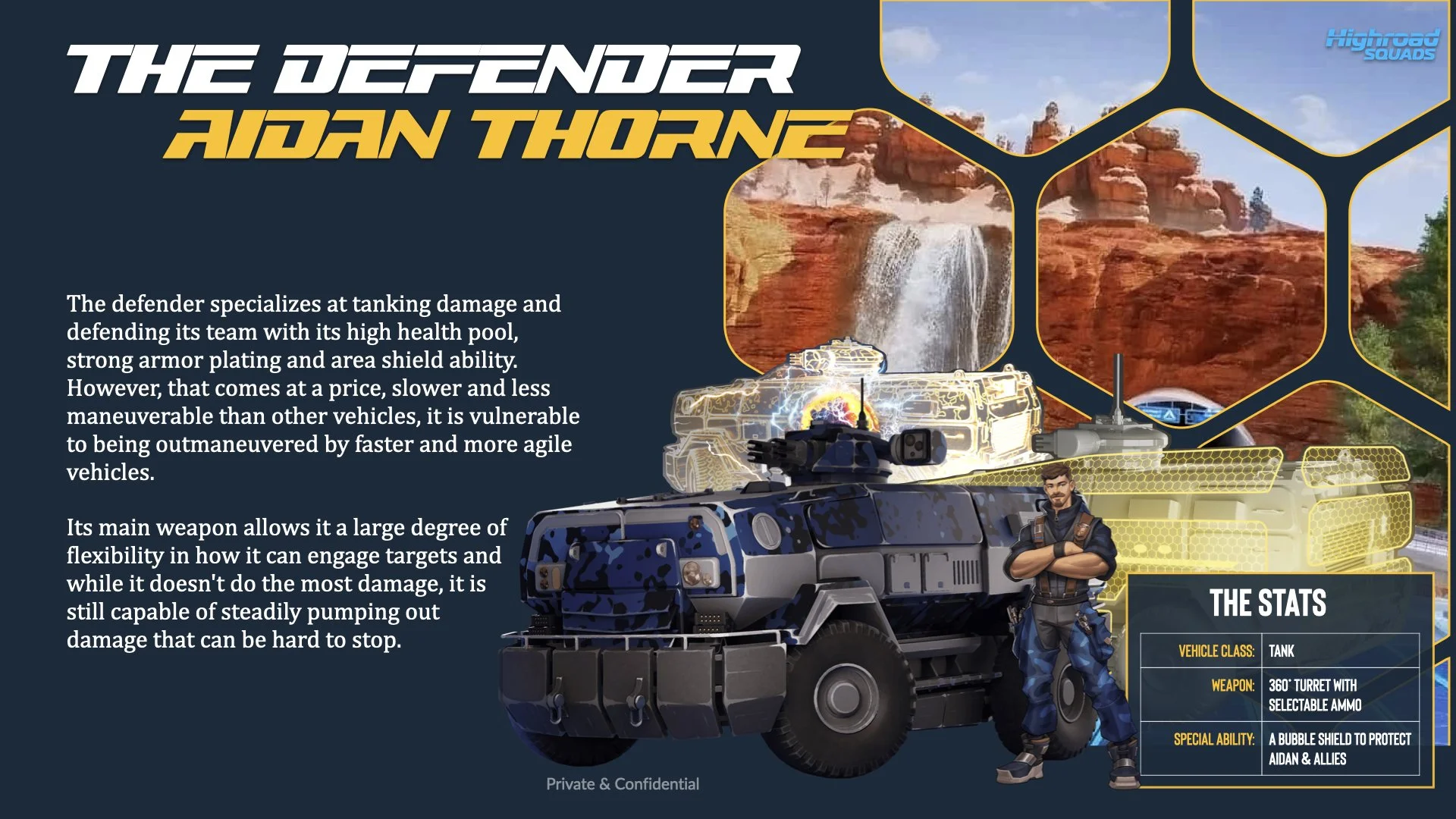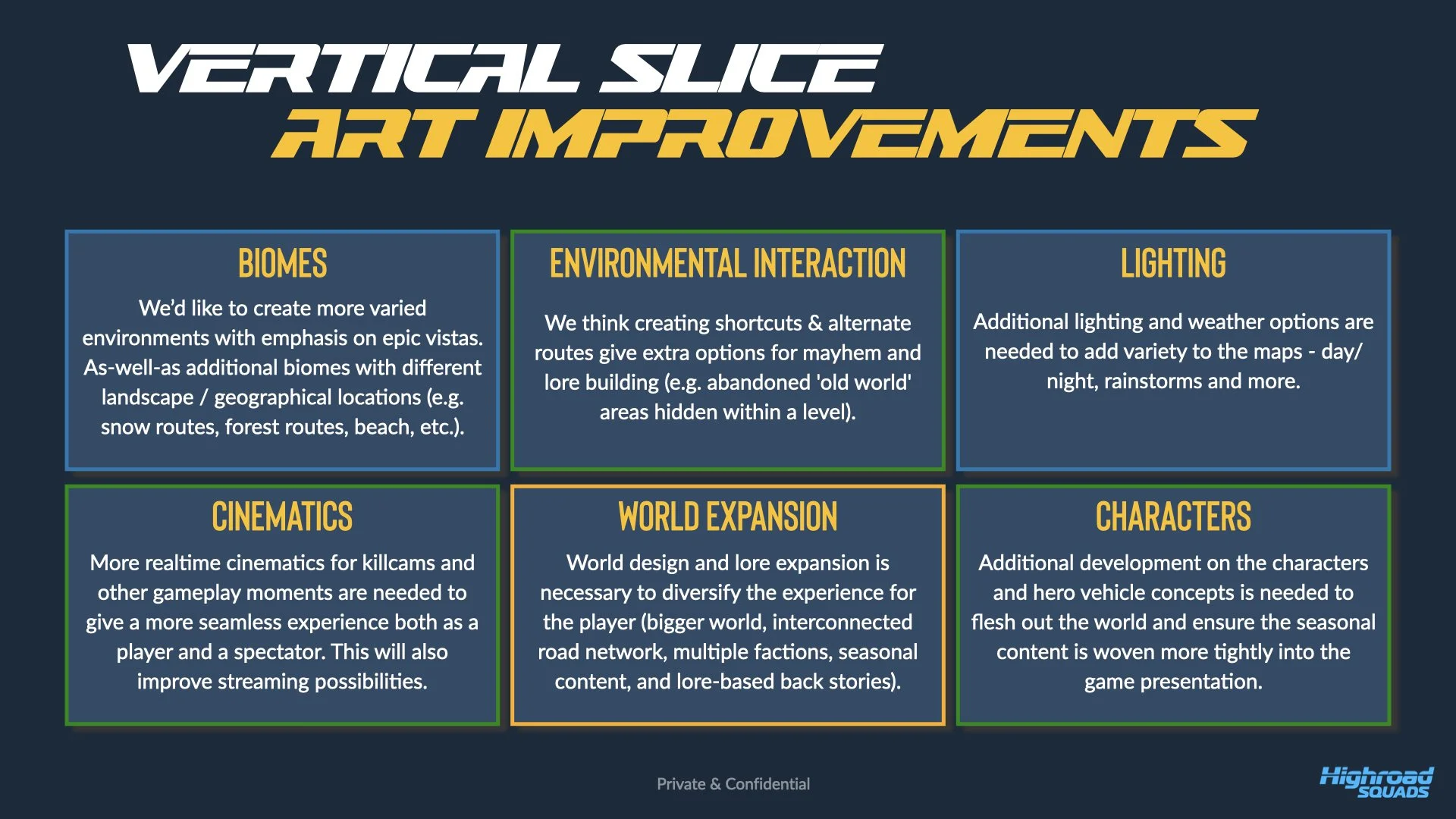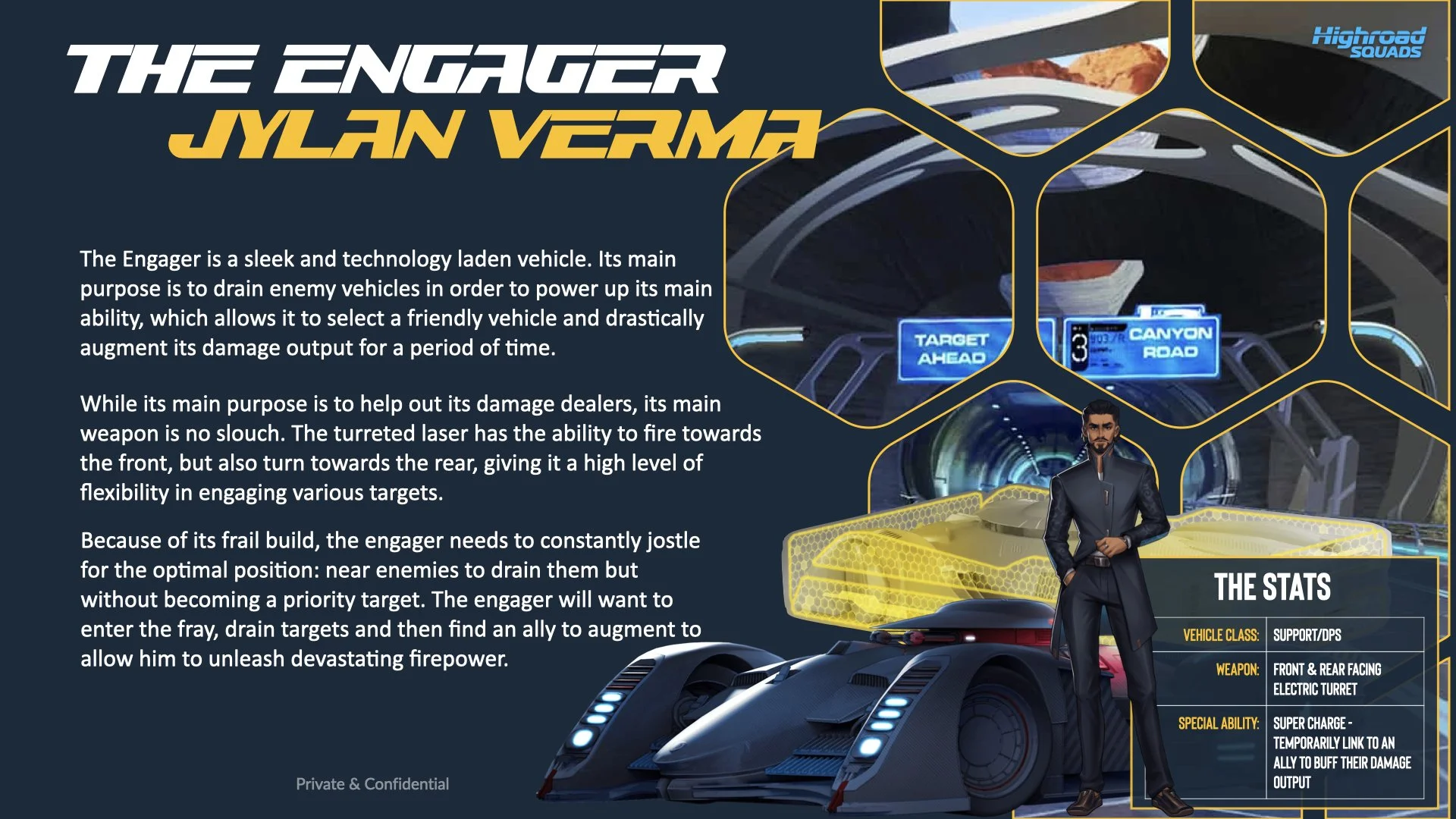 Highroad Squads was a new video game IP seeking investment. A group of seasoned developers set out to make an innovative, hero-based, 5V5 convoy combat game, with advanced driving and shooting elements, designed for friends and families of all ages from across the world. The colorful arcade experience, with deep gameplay features and strong community elements, are designed to promote replayability and drive competitive spirit.