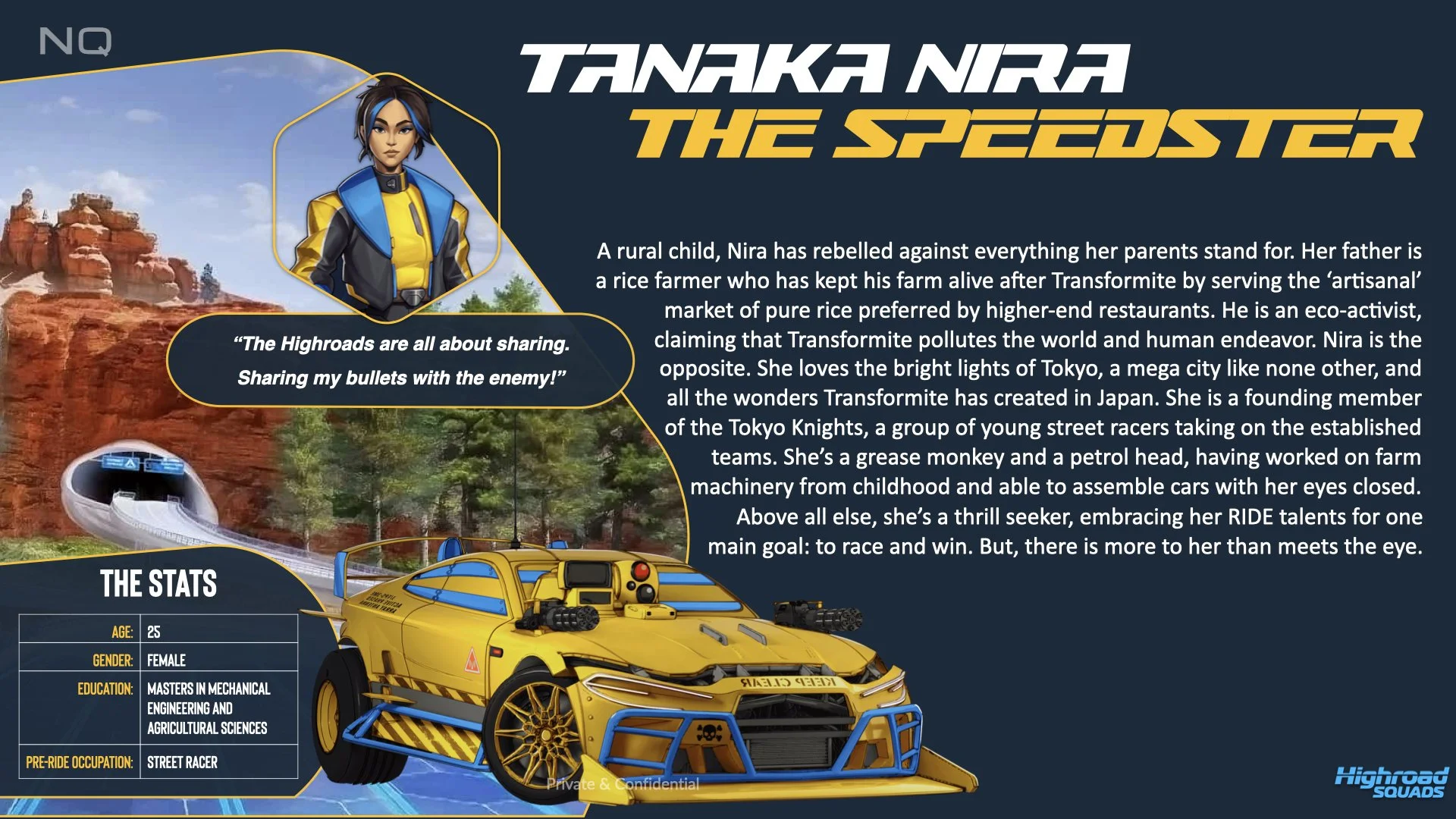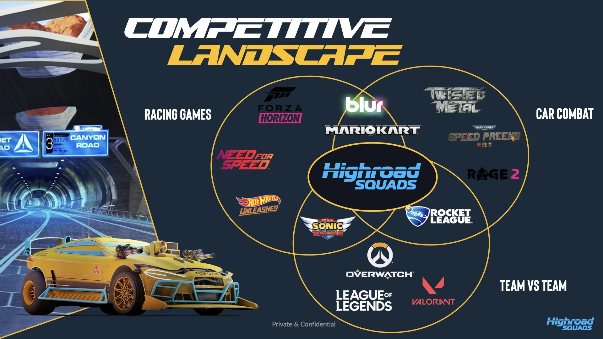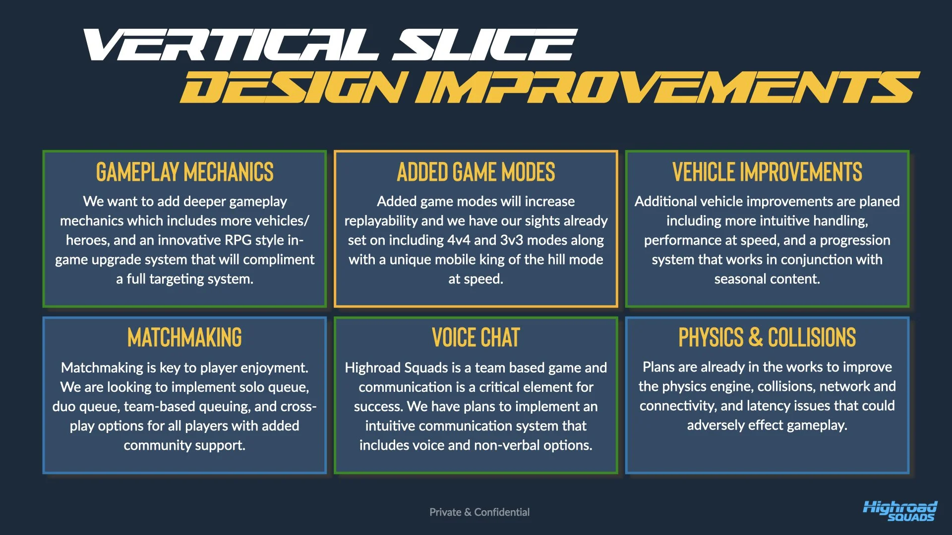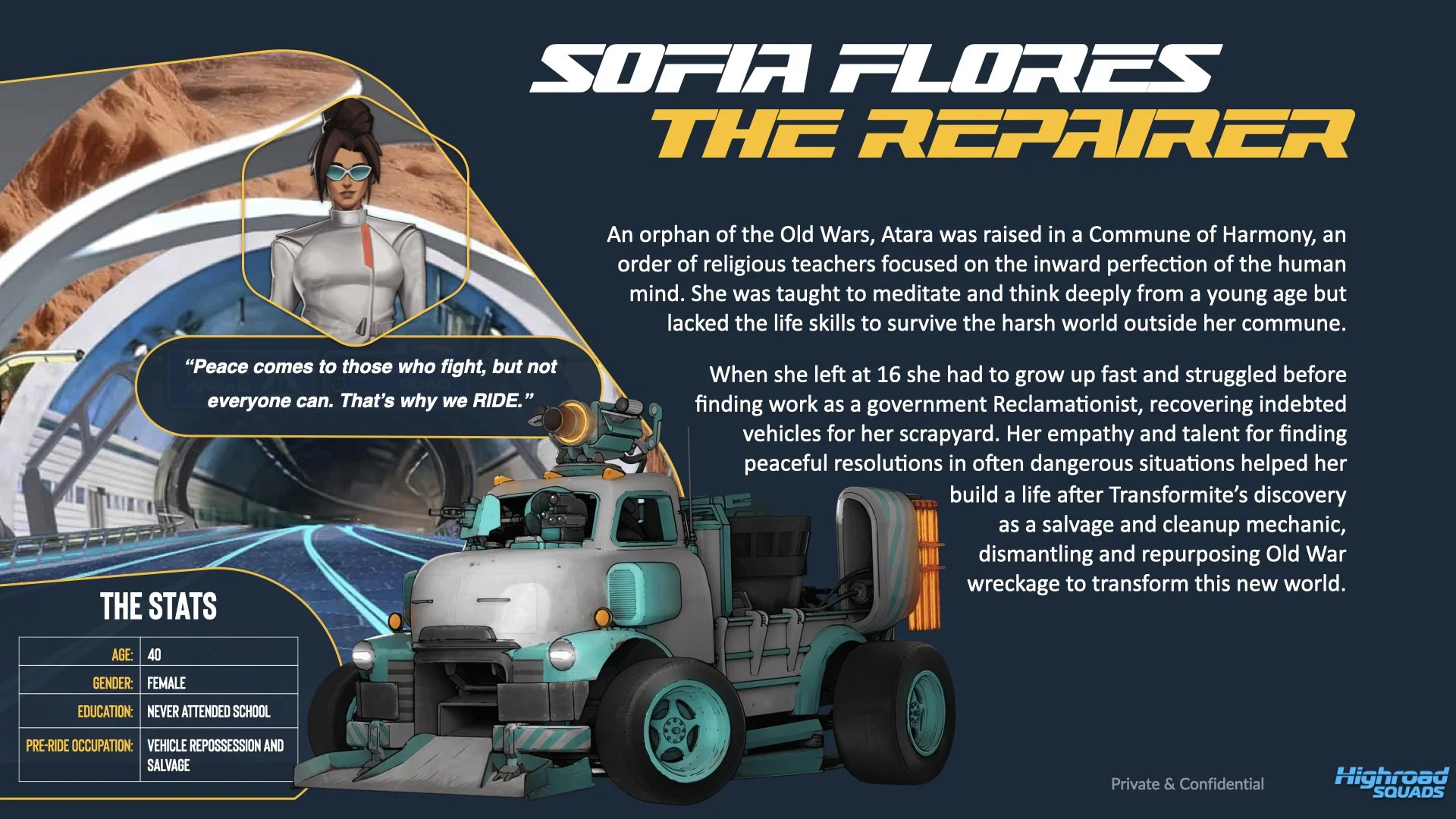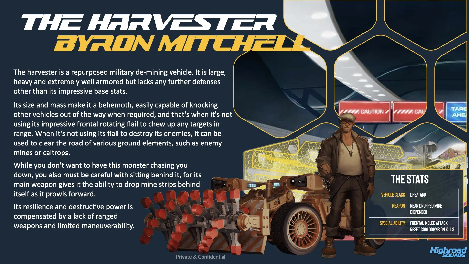 Highroad Squads was a new video game IP seeking investment. A group of seasoned developers set out to make an innovative, hero-based, 5V5 convoy combat game, with advanced driving and shooting elements, designed for friends and families of all ages from across the world. The colorful arcade experience, with deep gameplay features and strong community elements, are designed to promote replayability and drive competitive spirit.