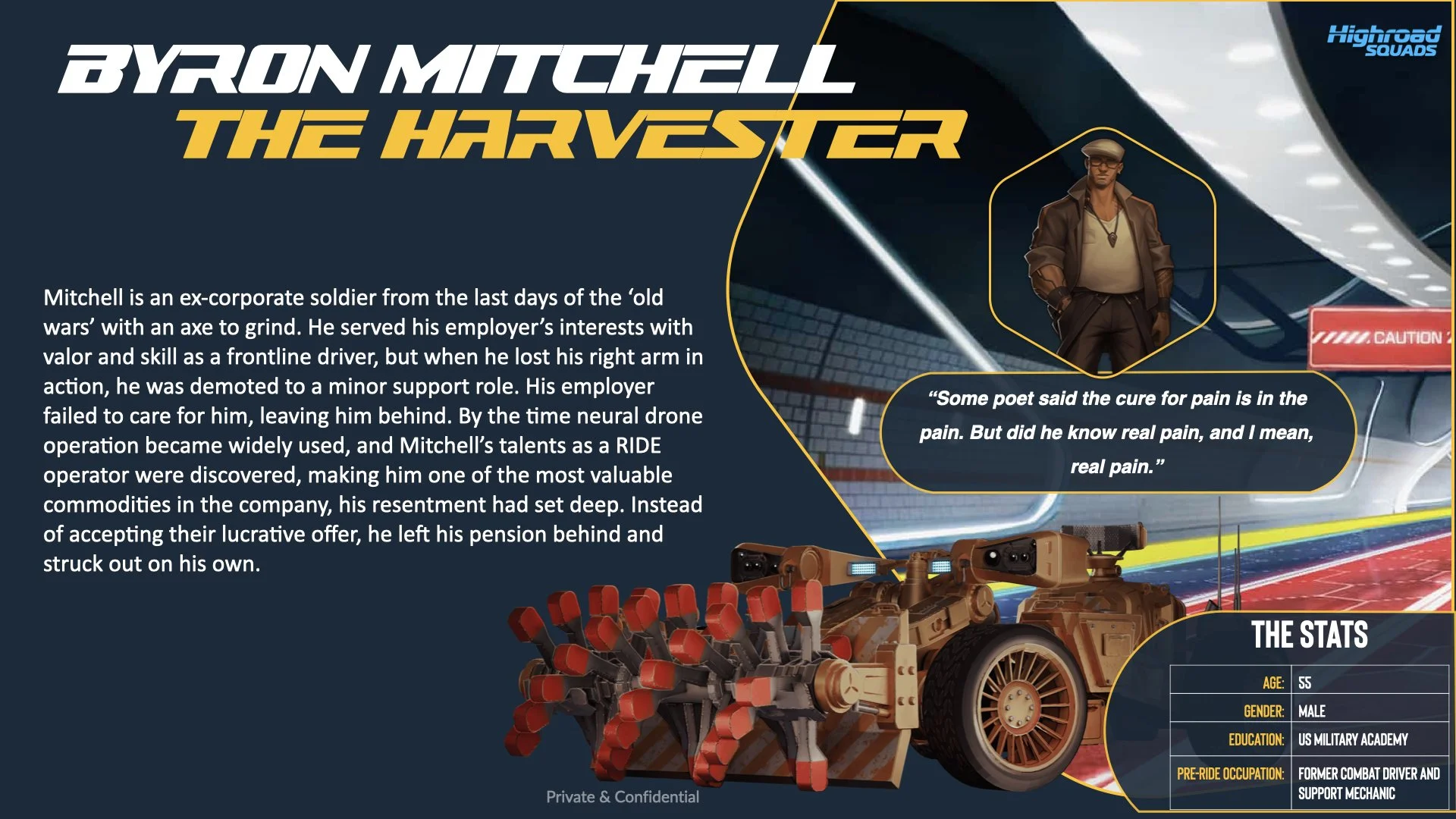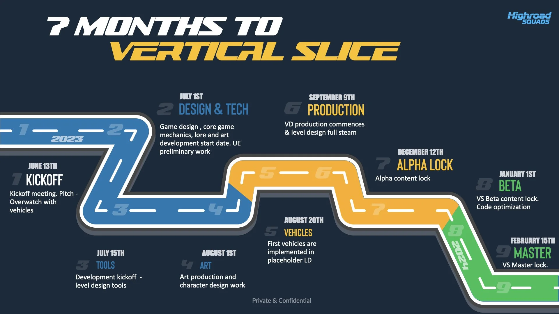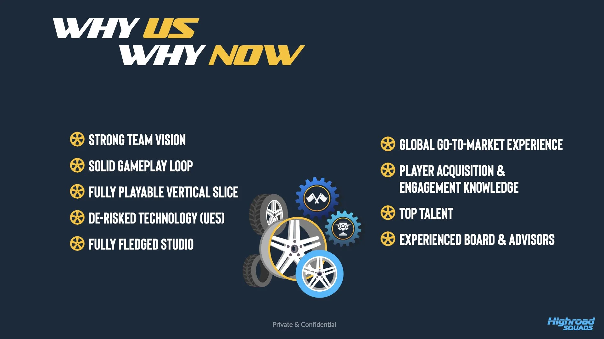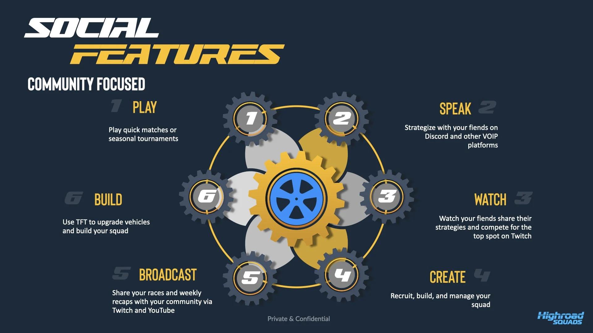 Highroad Squads was a new video game IP seeking investment. A group of seasoned developers set out to make an innovative, hero-based, 5V5 convoy combat game, with advanced driving and shooting elements, designed for friends and families of all ages from across the world. The colorful arcade experience, with deep gameplay features and strong community elements, are designed to promote replayability and drive competitive spirit.