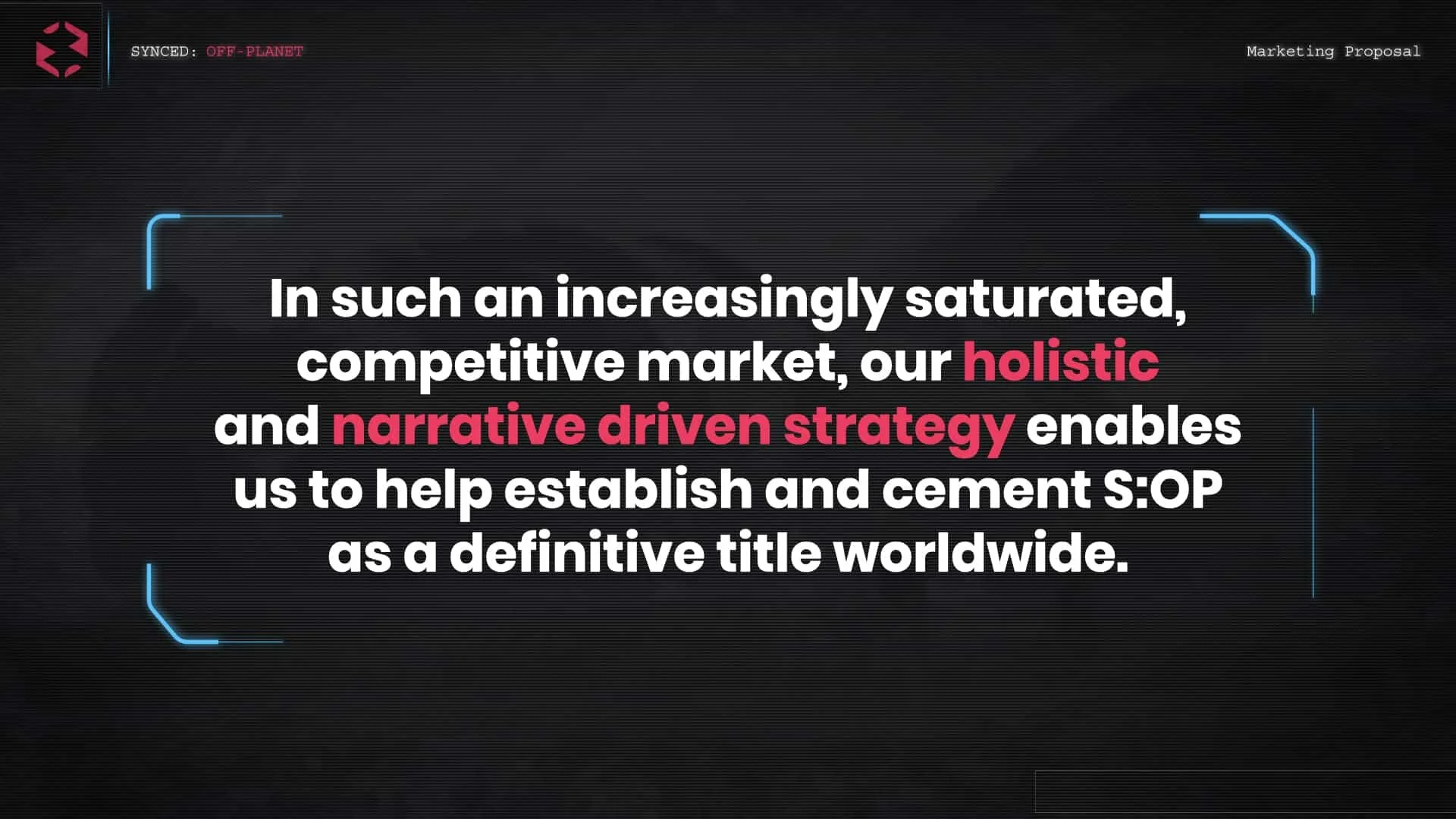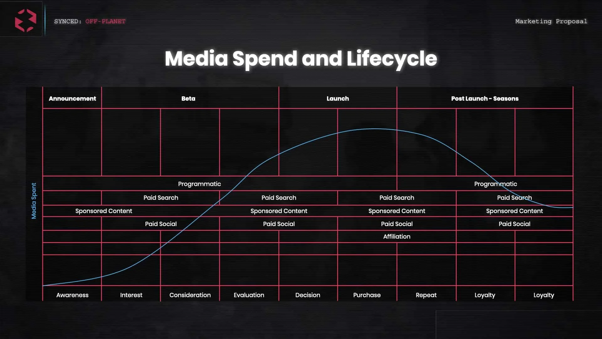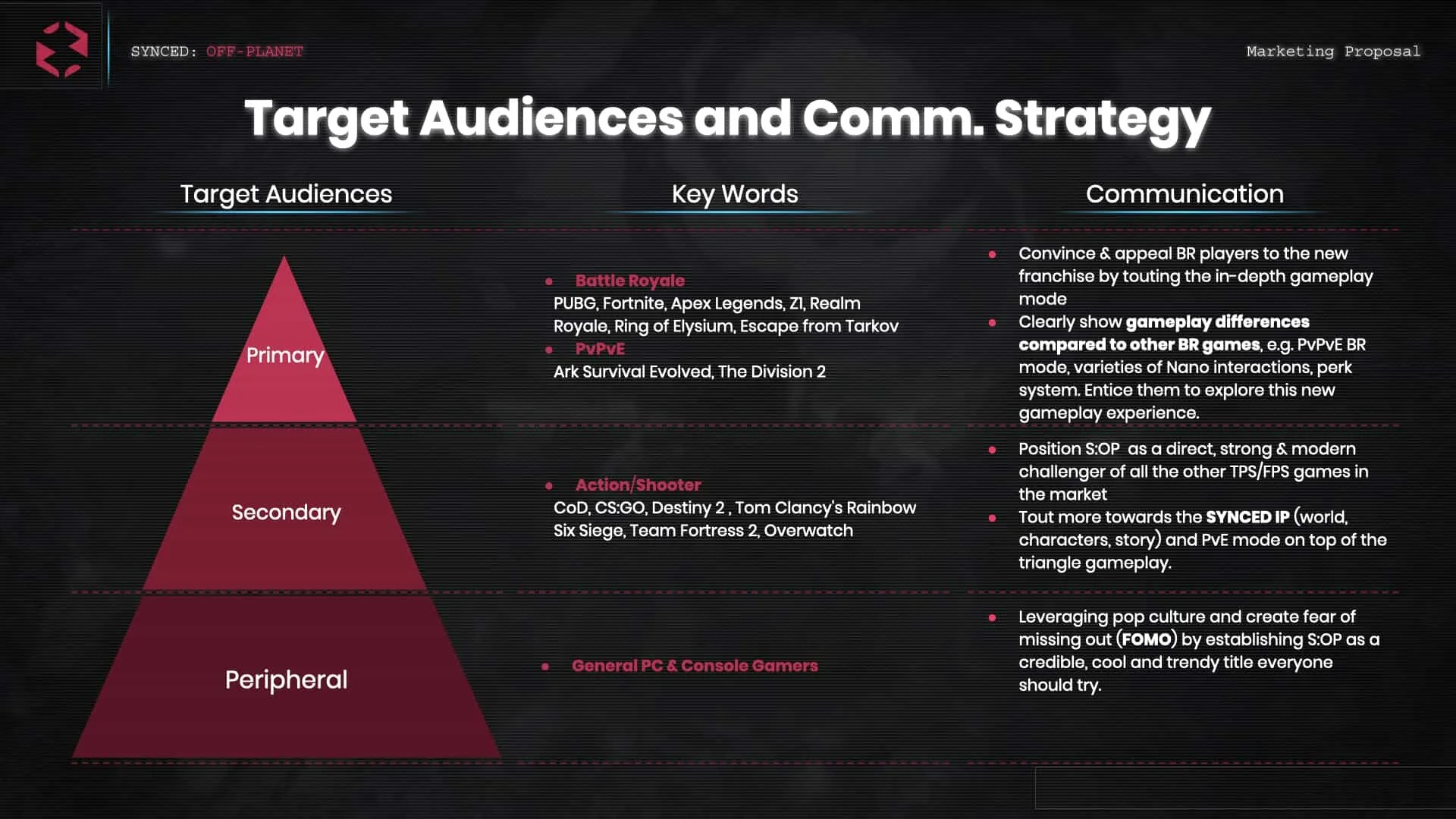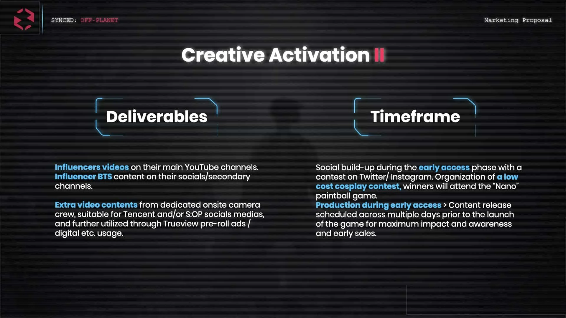 Tencent Games was looking to support their upcoming global release of Synced: Off Planet with a massive international rollout. With a crowded battle royal space, and an industry looking to recreate the success of Apex Legends, a new approach was needed in order to capture the market and standout from the pack. After extensive brand building with the studio, the below wholistic plan was created to support the AAA release.