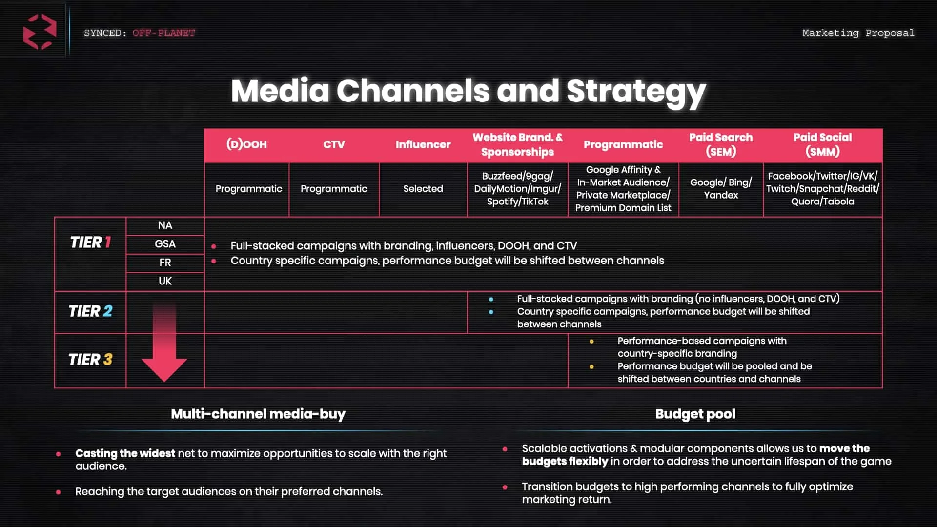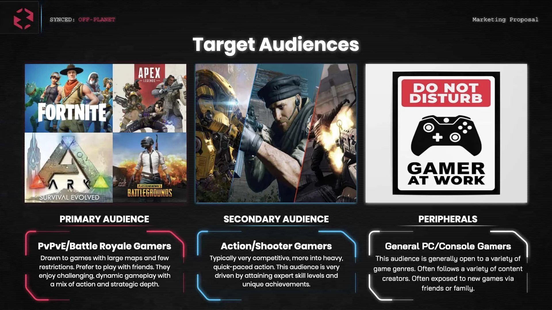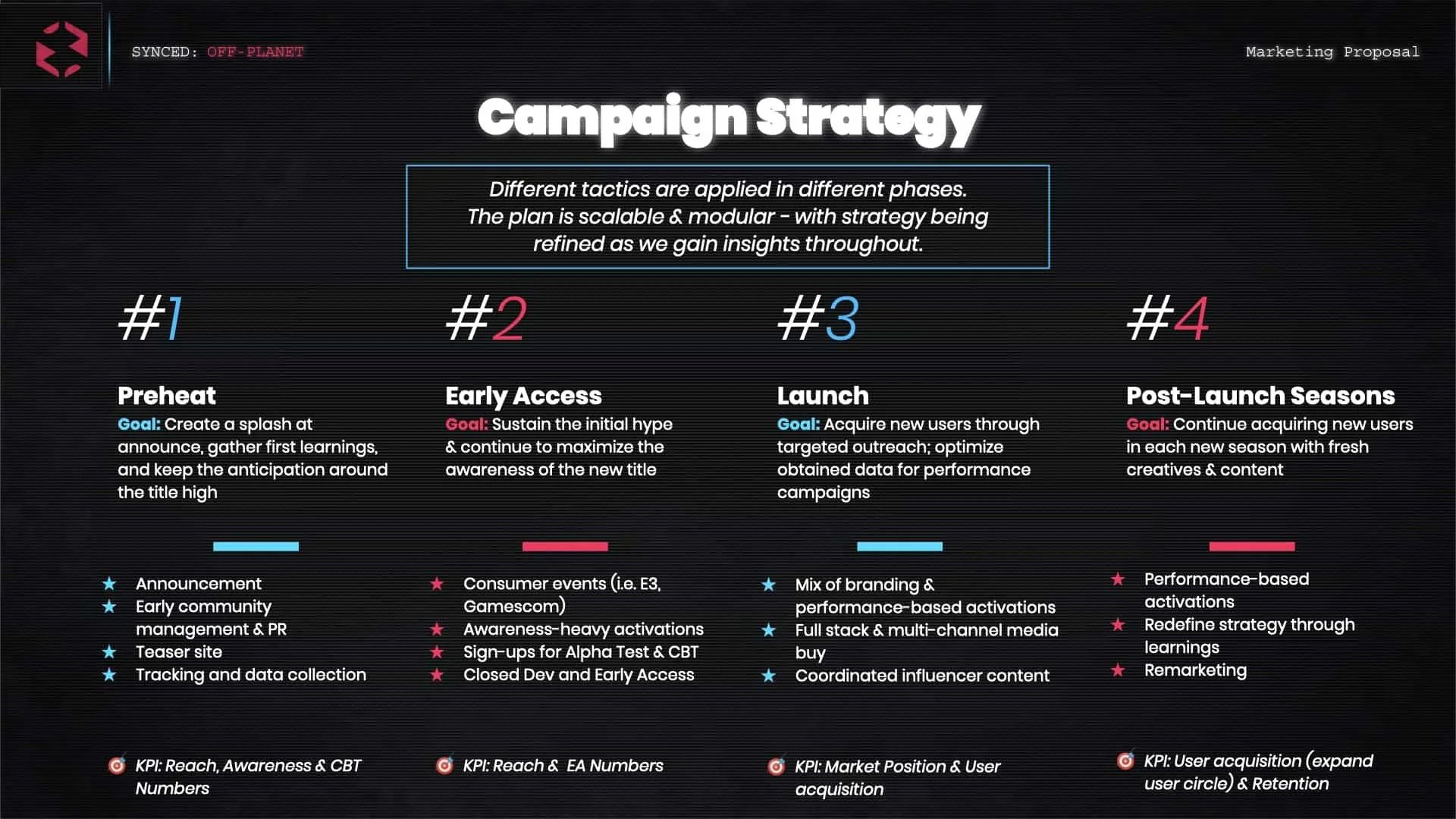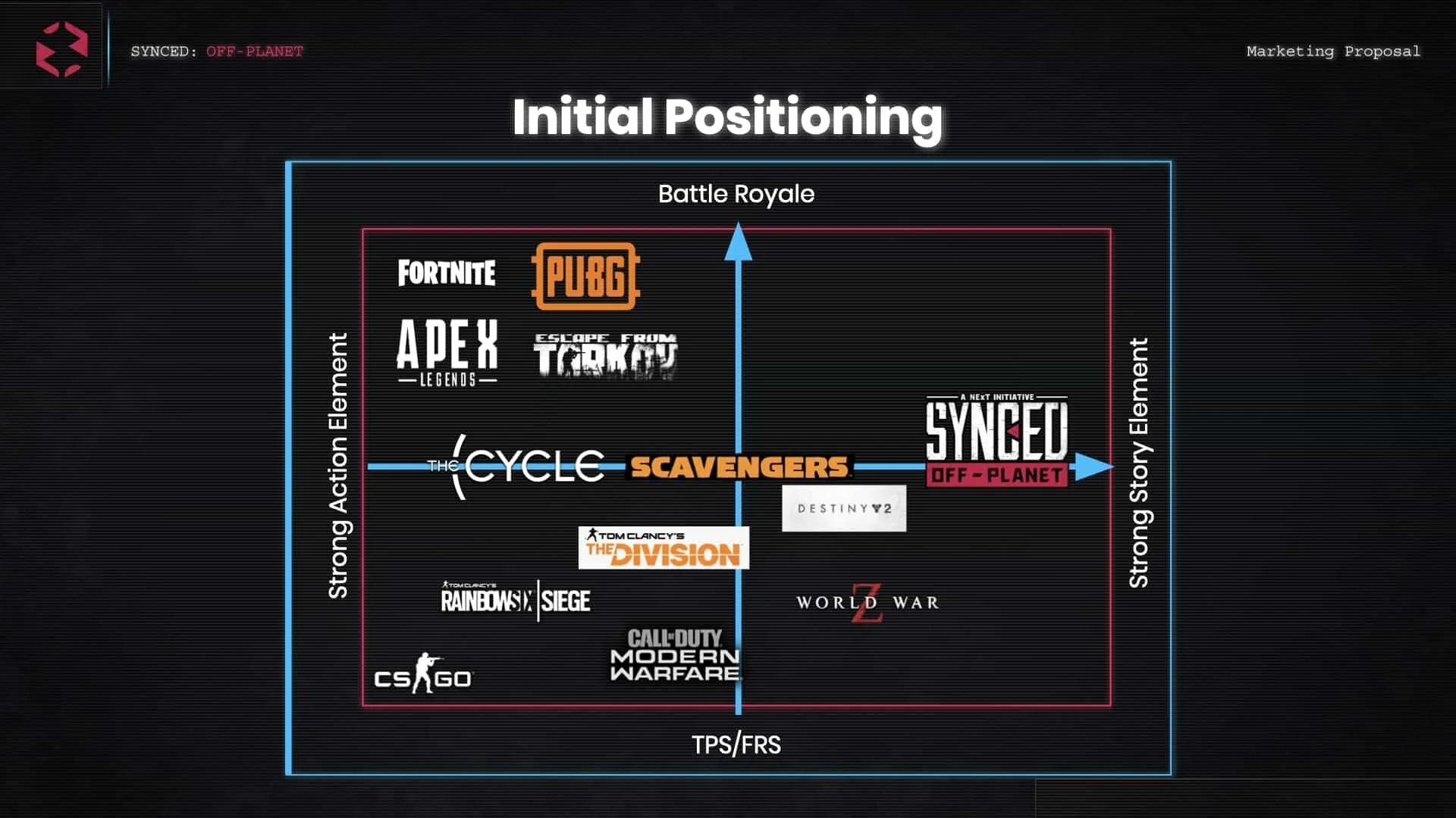 Tencent Games was looking to support their upcoming global release of Synced: Off Planet with a massive international rollout. With a crowded battle royal space, and an industry looking to recreate the success of Apex Legends, a new approach was needed in order to capture the market and standout from the pack. After extensive brand building with the studio, the below wholistic plan was created to support the AAA release.