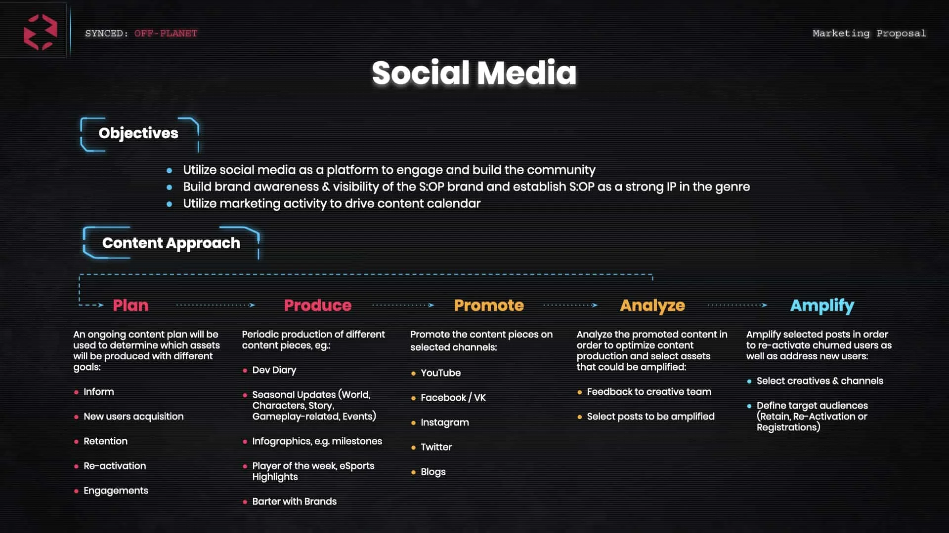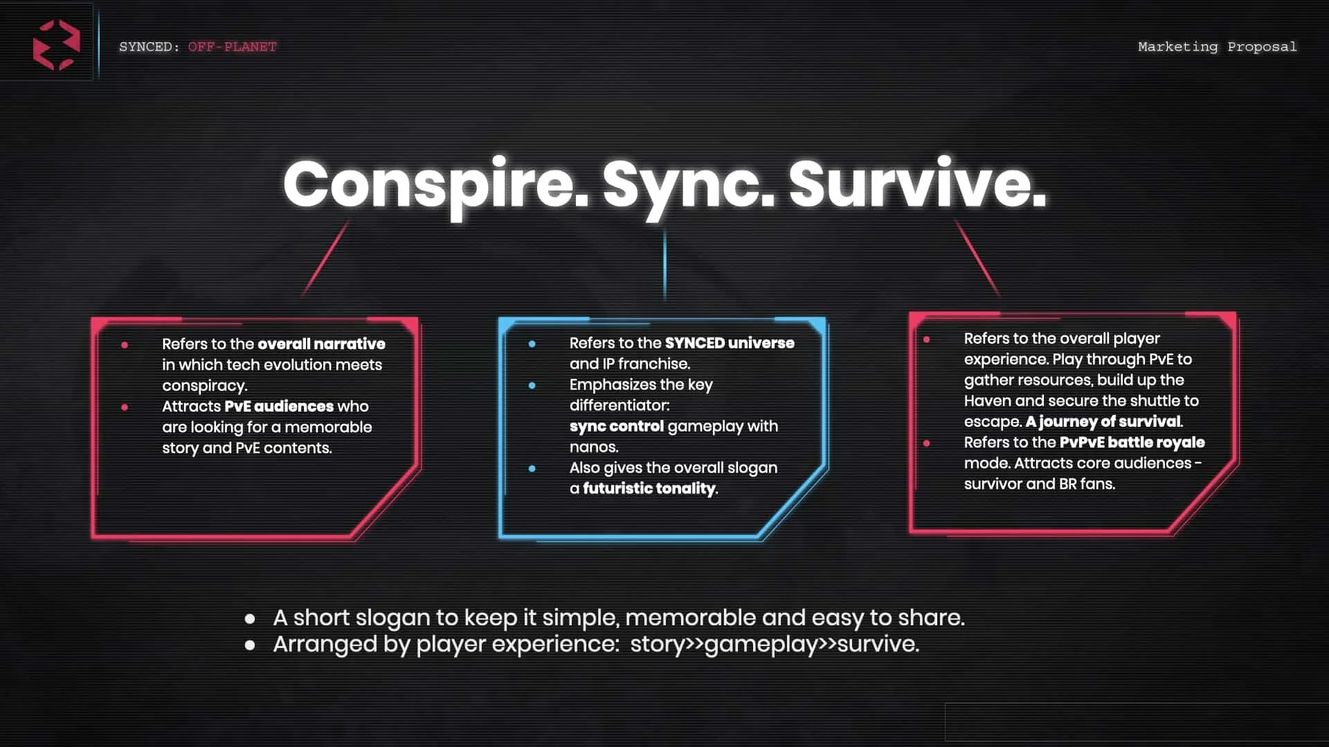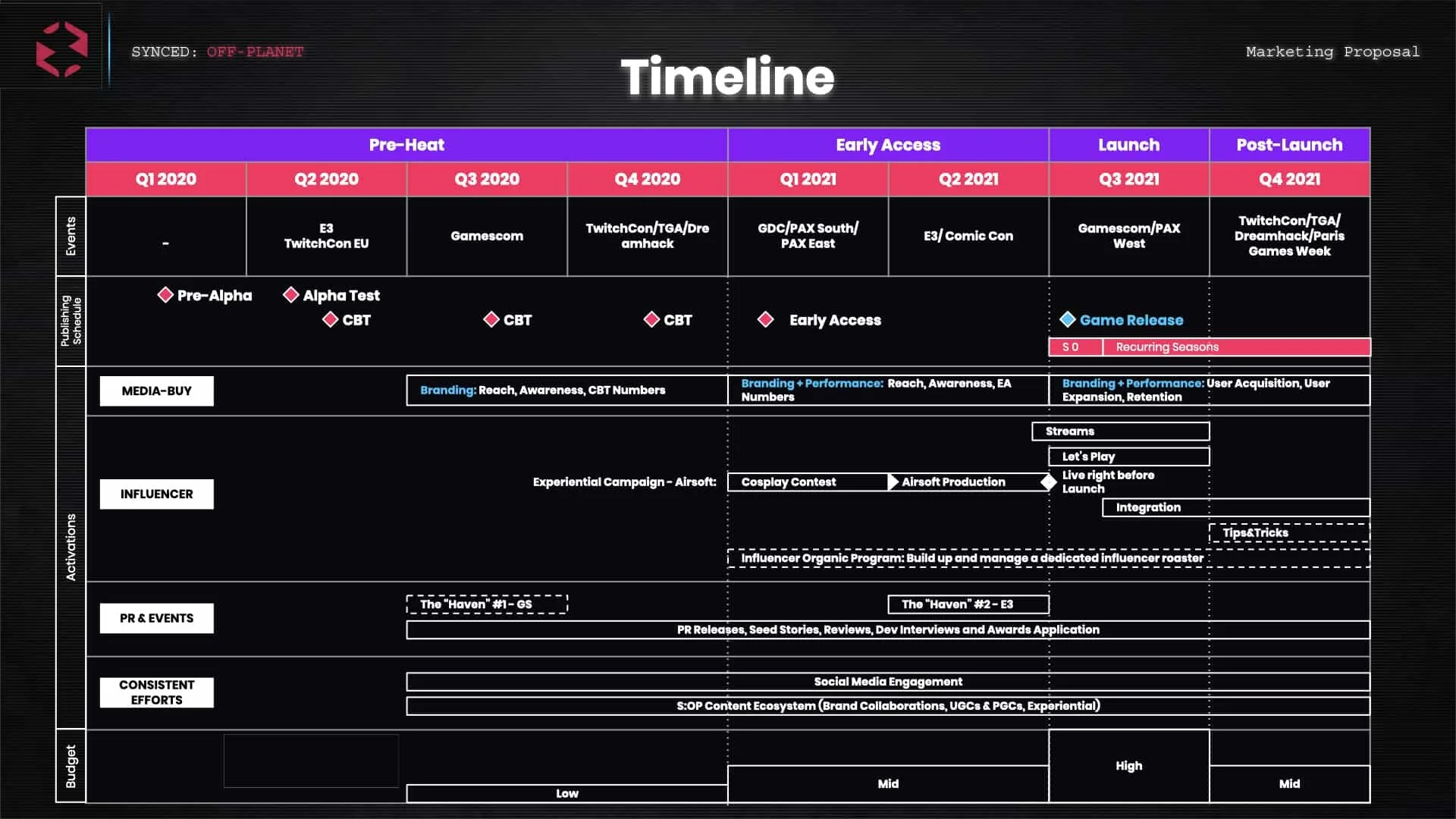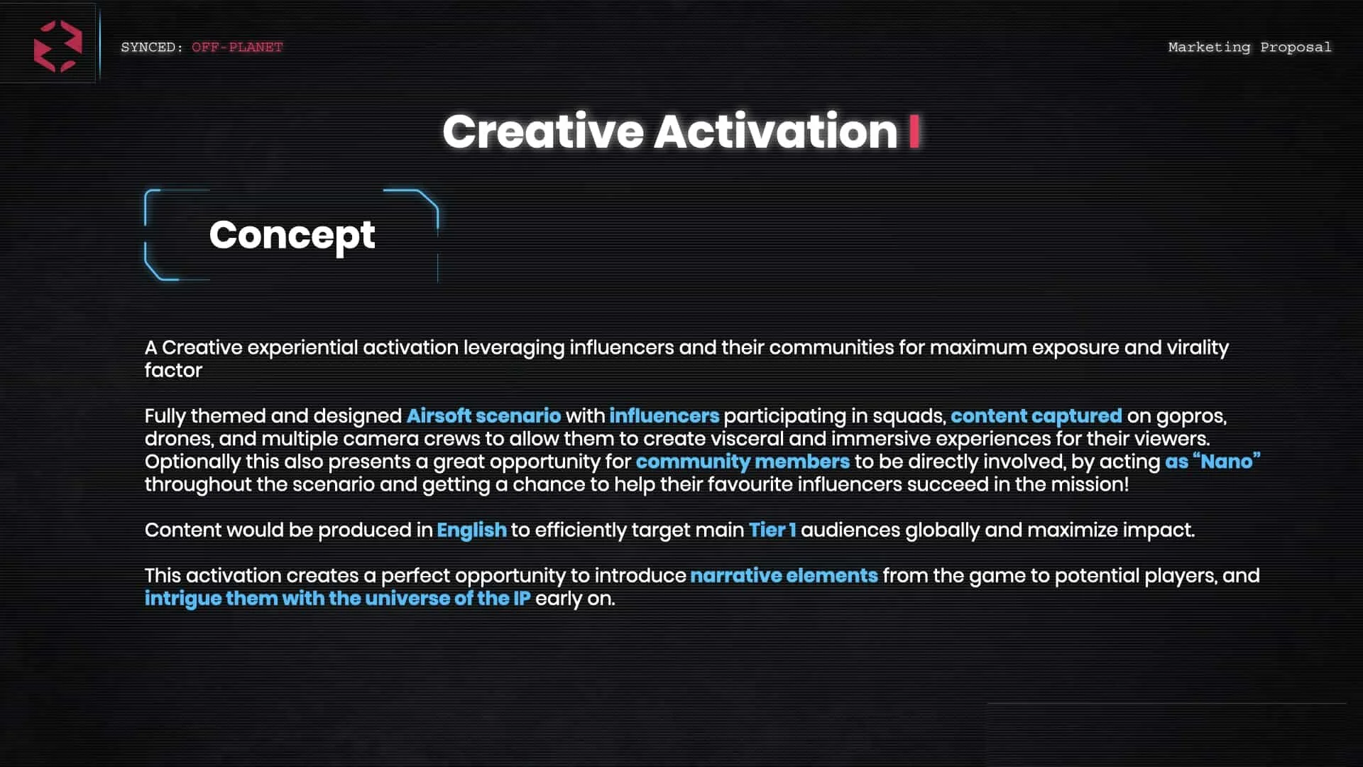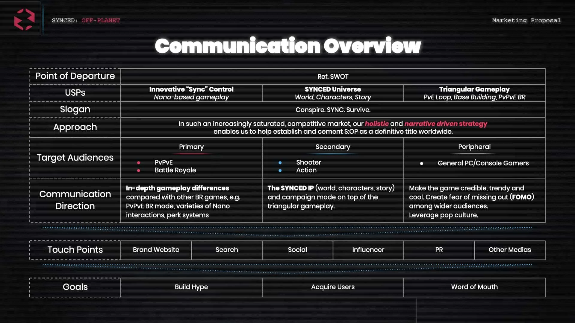 Tencent Games was looking to support their upcoming global release of Synced: Off Planet with a massive international rollout. With a crowded battle royal space, and an industry looking to recreate the success of Apex Legends, a new approach was needed in order to capture the market and standout from the pack. After extensive brand building with the studio, the below wholistic plan was created to support the AAA release.