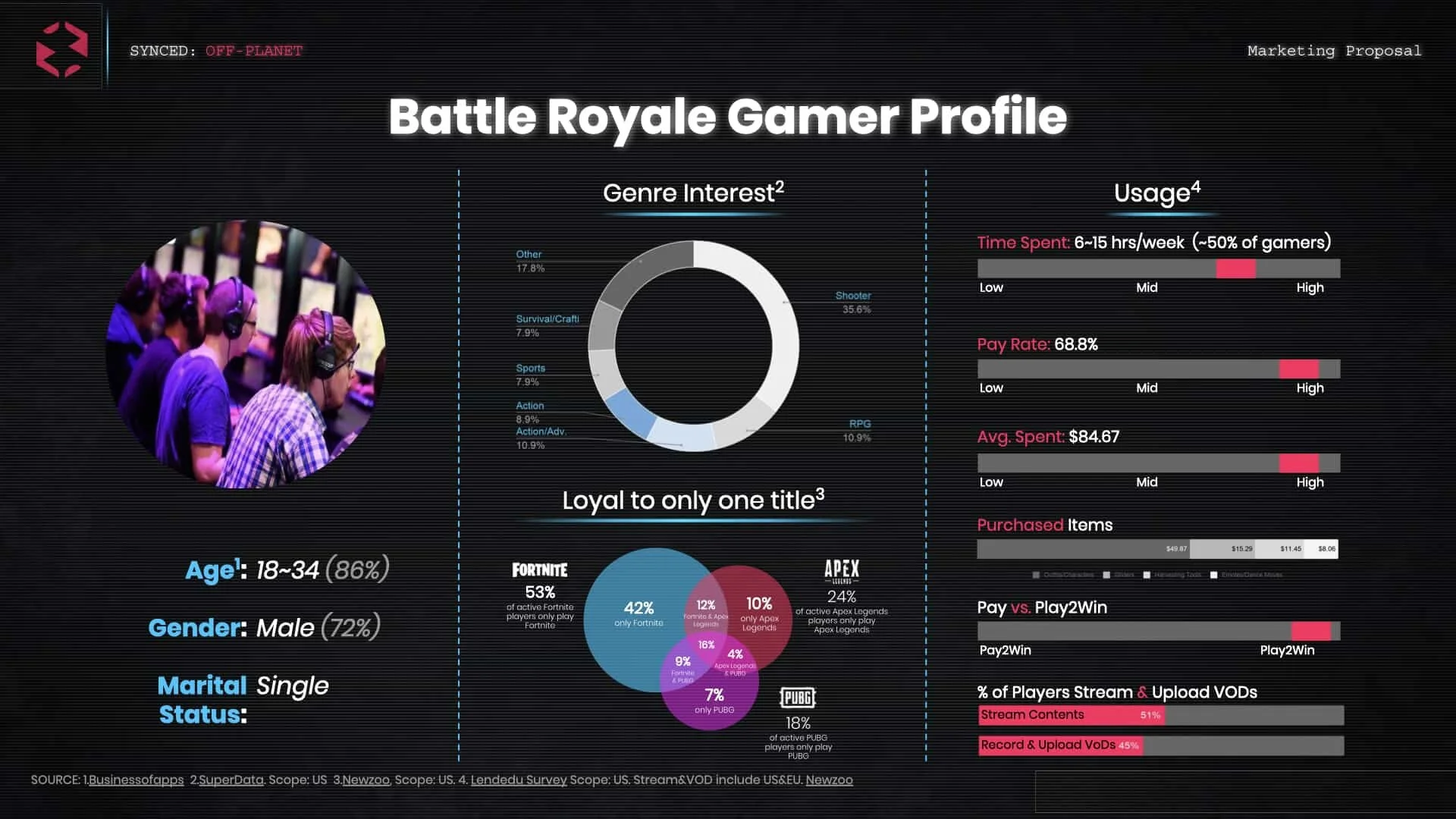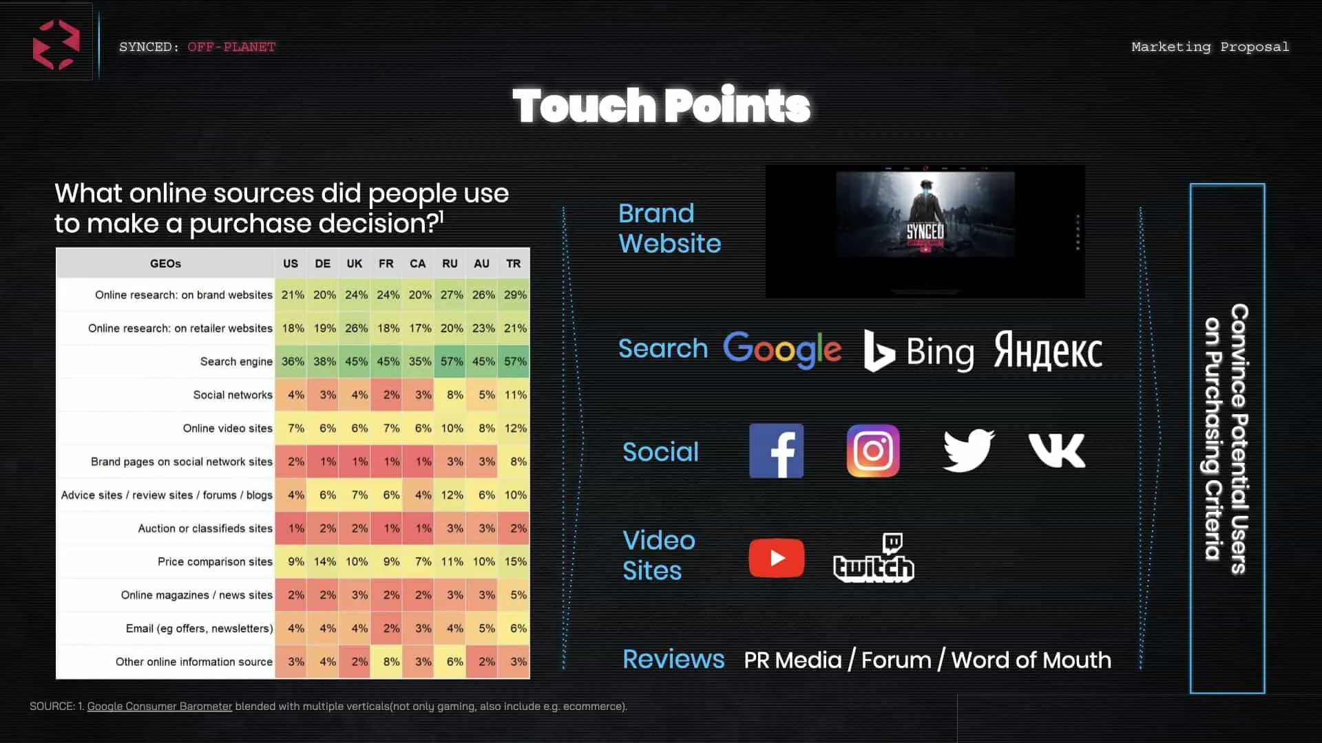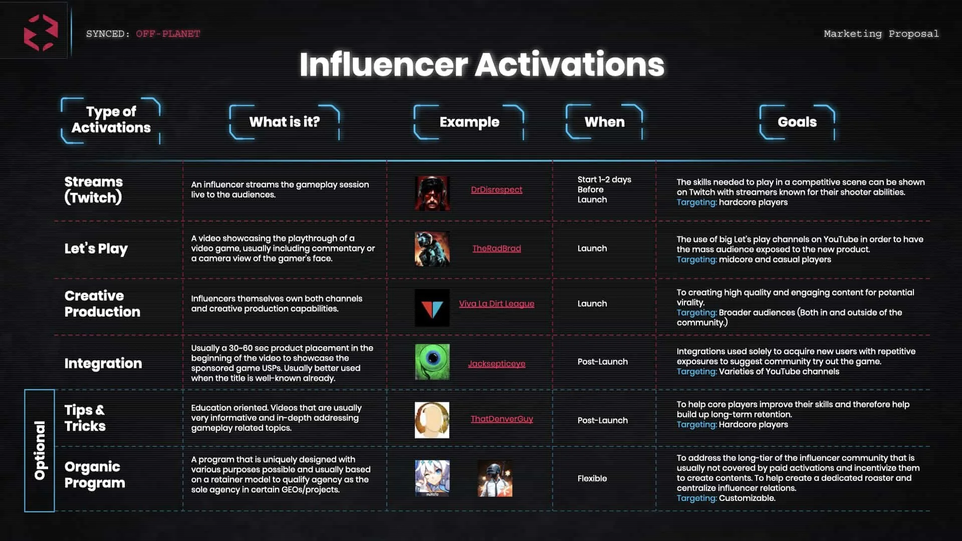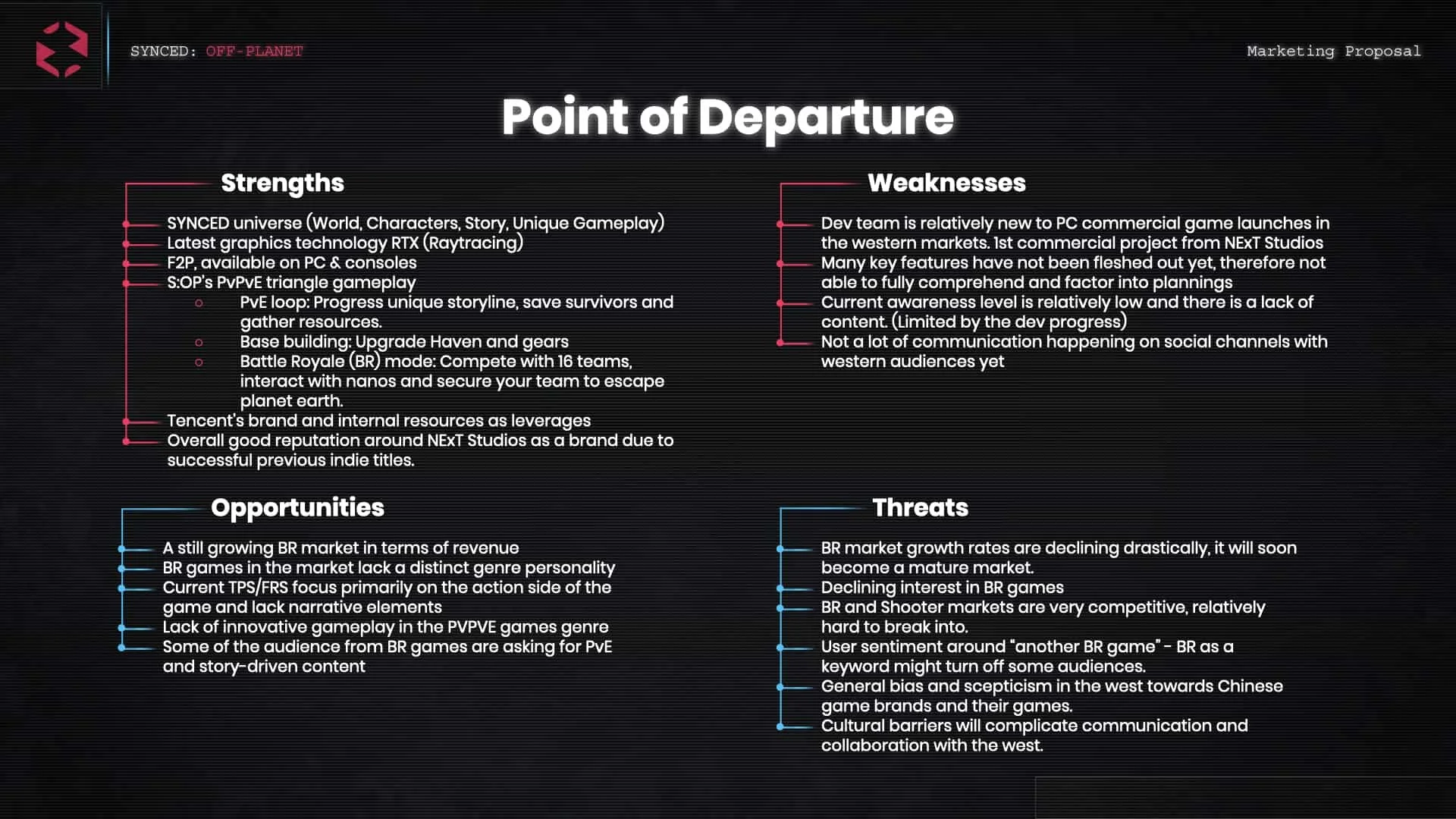 Tencent Games was looking to support their upcoming global release of Synced: Off Planet with a massive international rollout. With a crowded battle royal space, and an industry looking to recreate the success of Apex Legends, a new approach was needed in order to capture the market and standout from the pack. After extensive brand building with the studio, the below wholistic plan was created to support the AAA release.